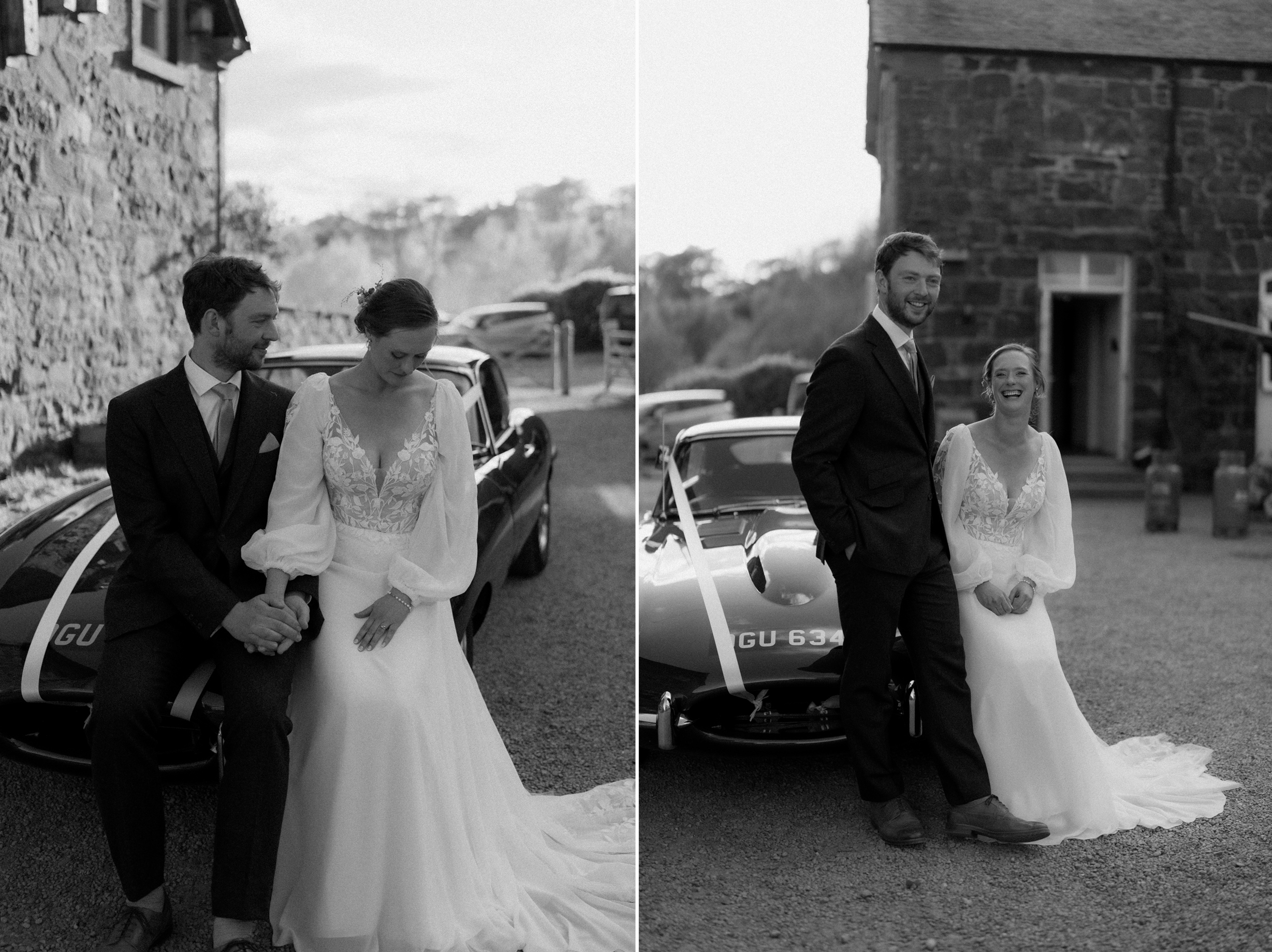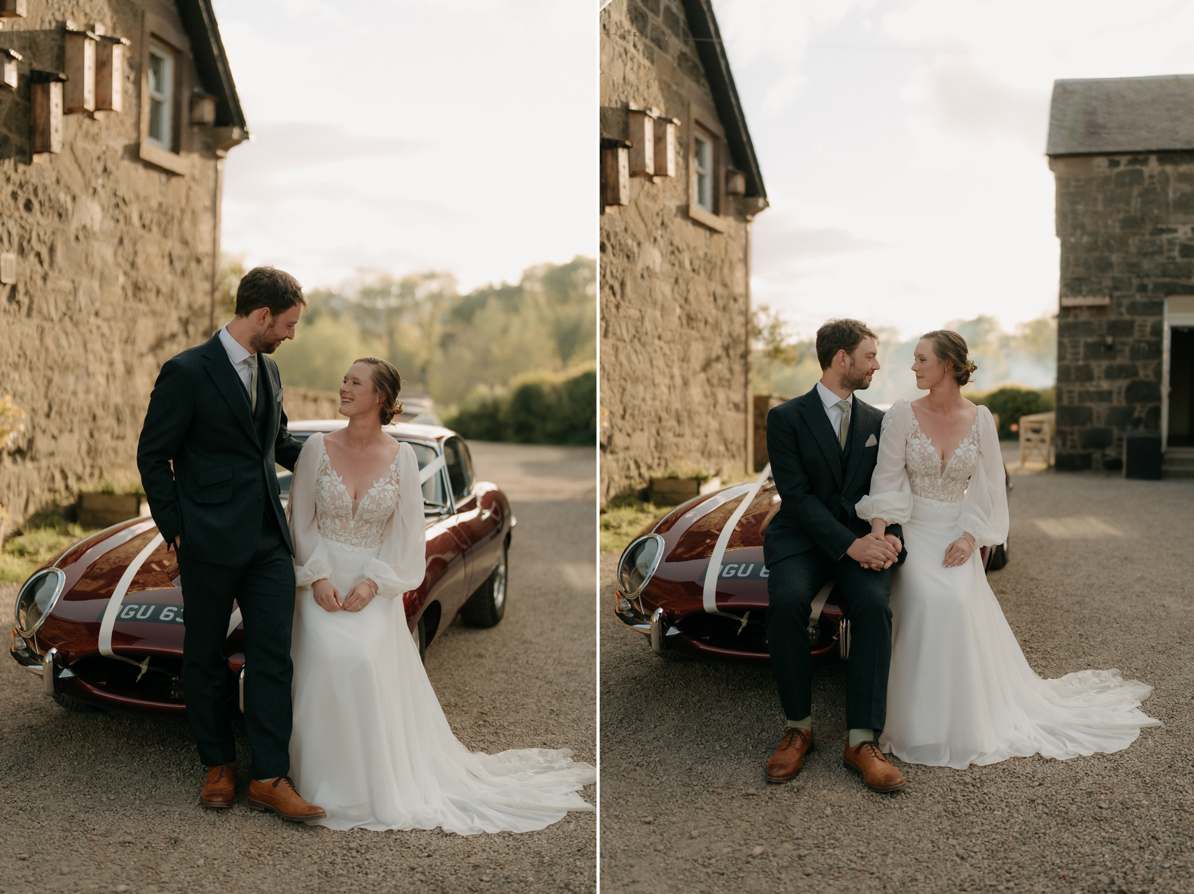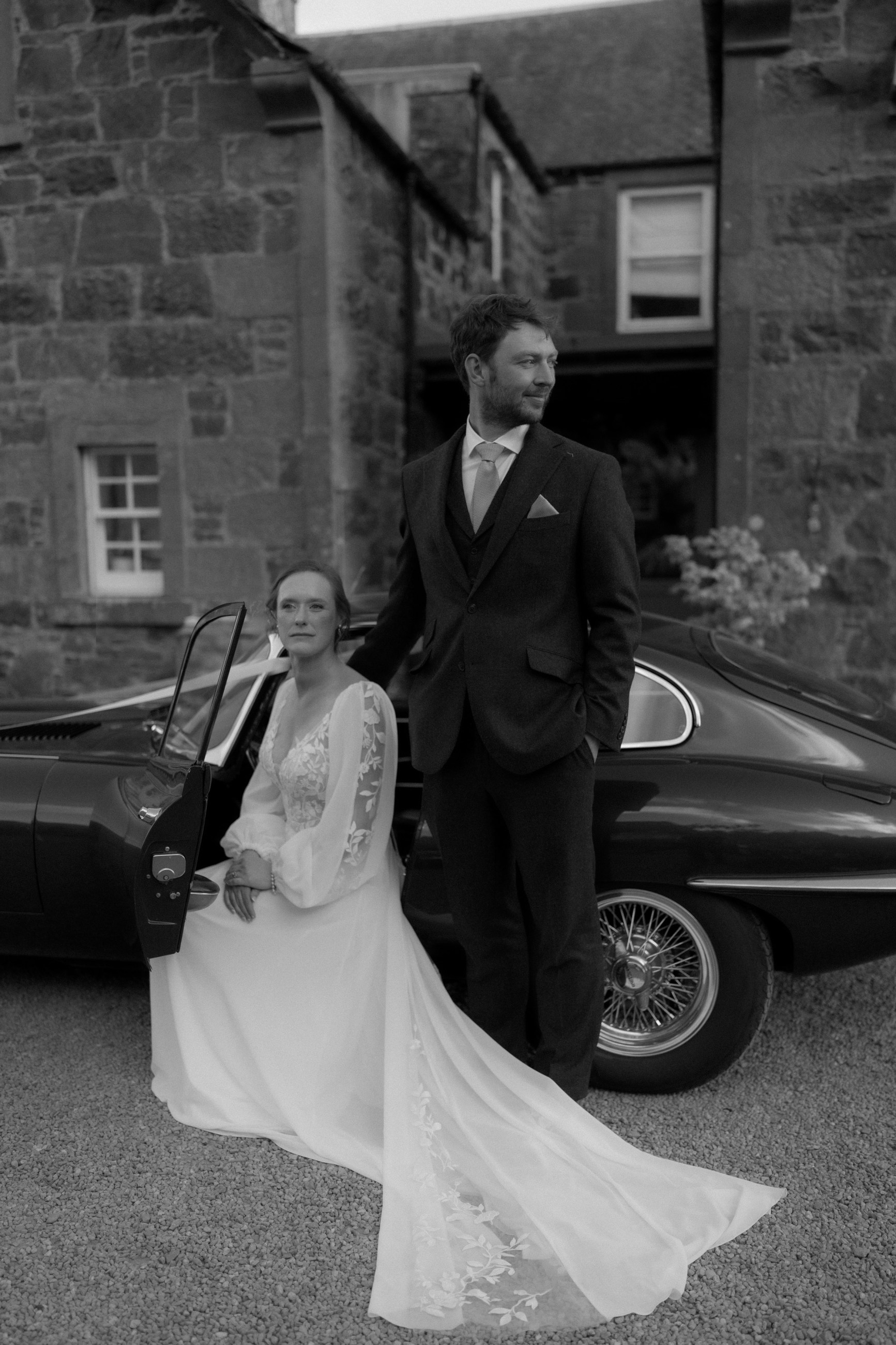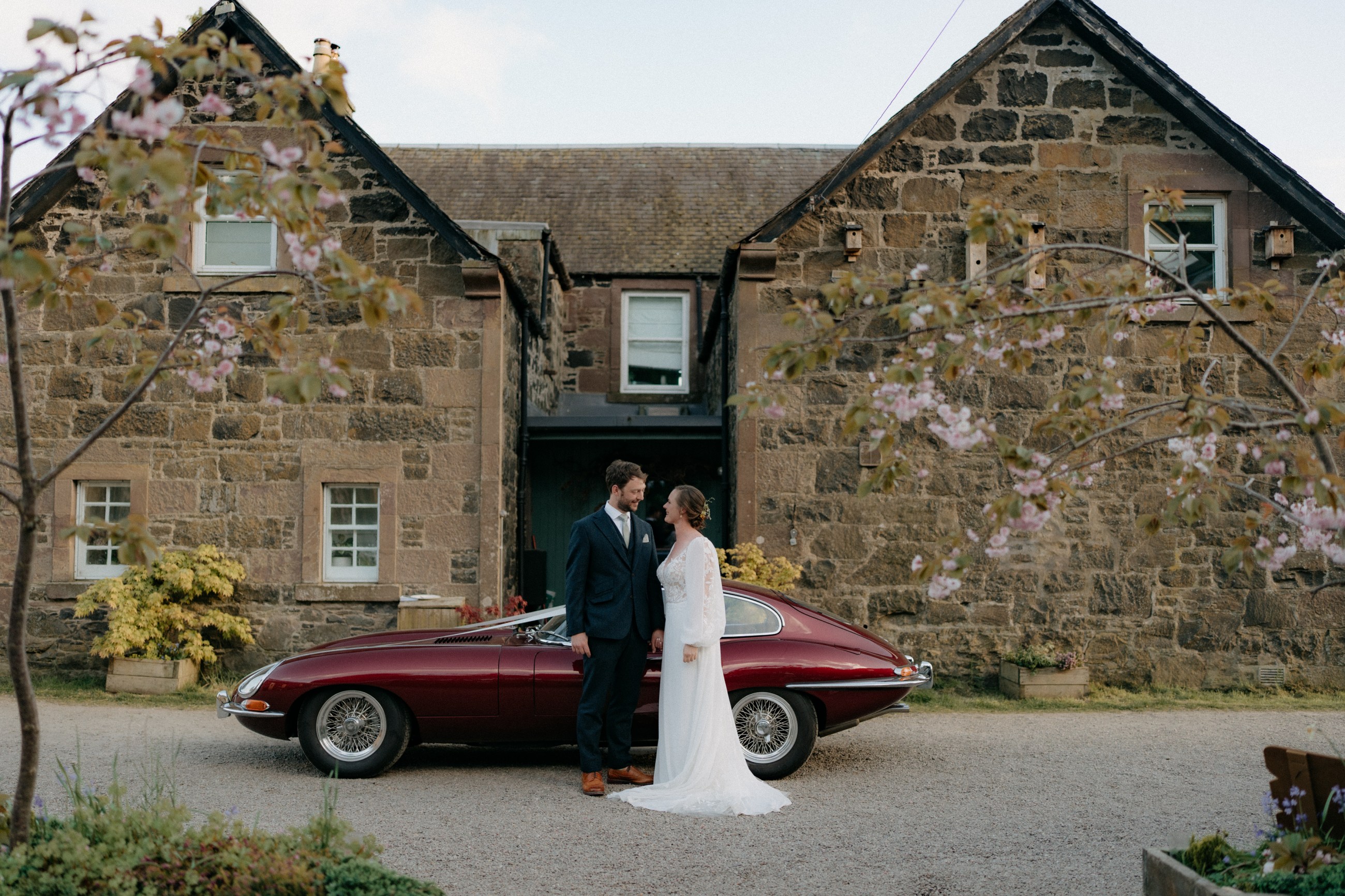 Sunshine, a courtyard ceremony, and a seriously beautiful old Jag — Andrea & John’s wedding at Comrie Croft was effortlessly elegant from start to finish.