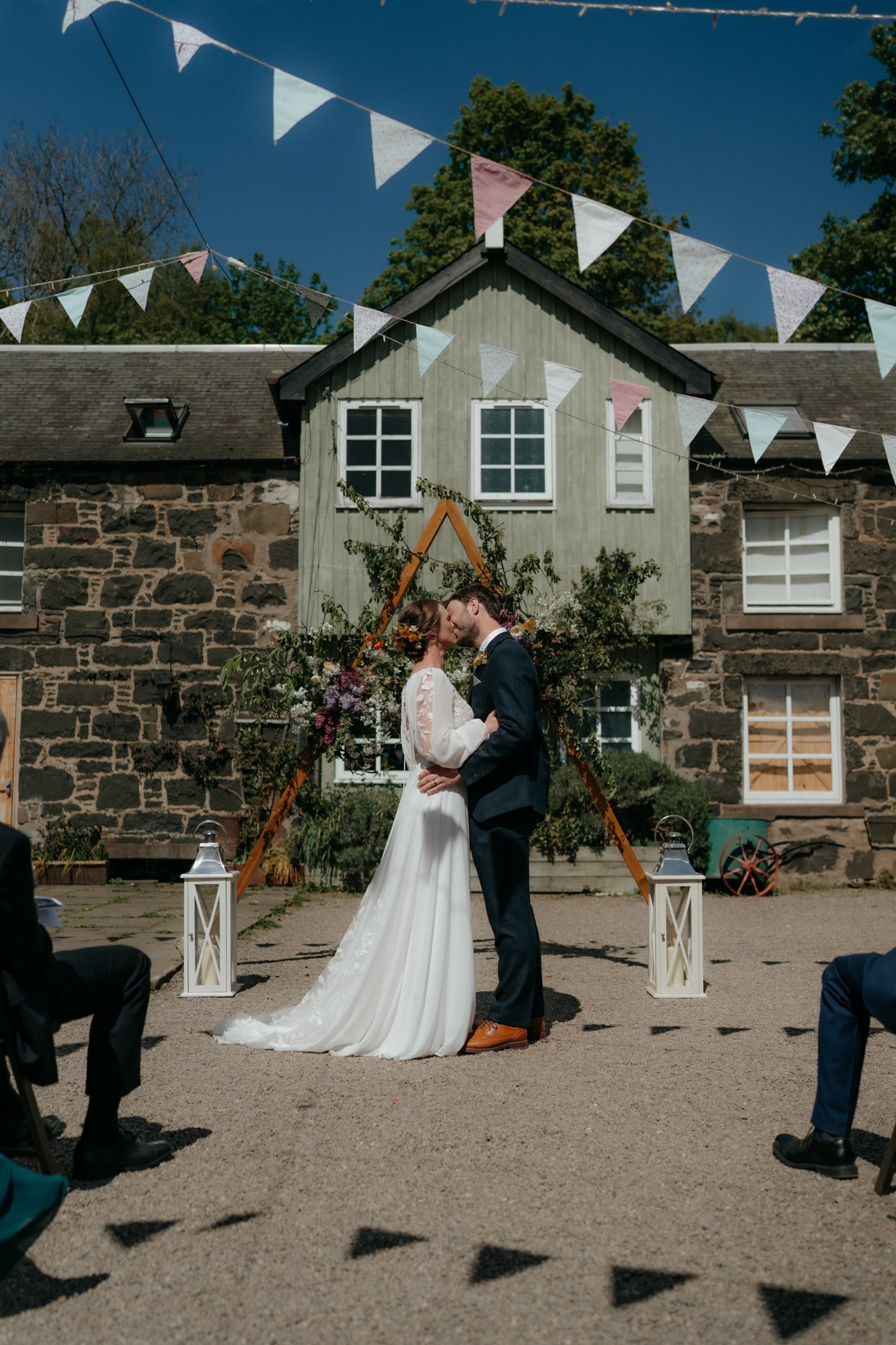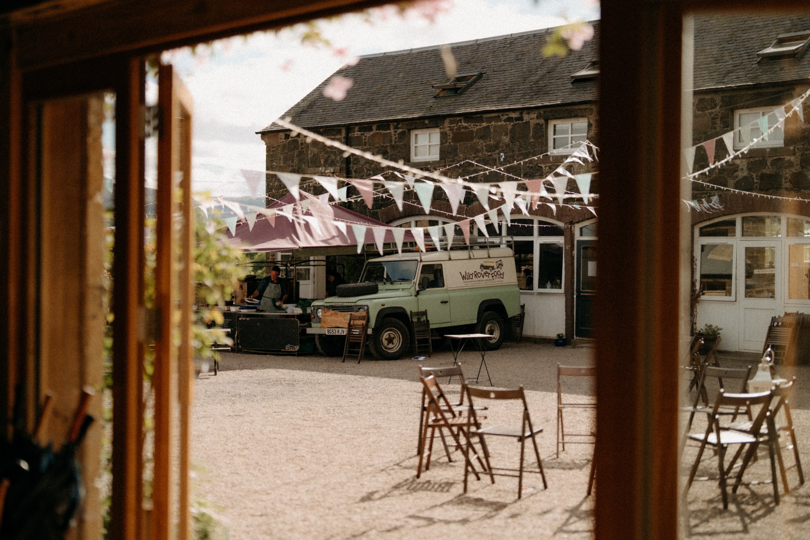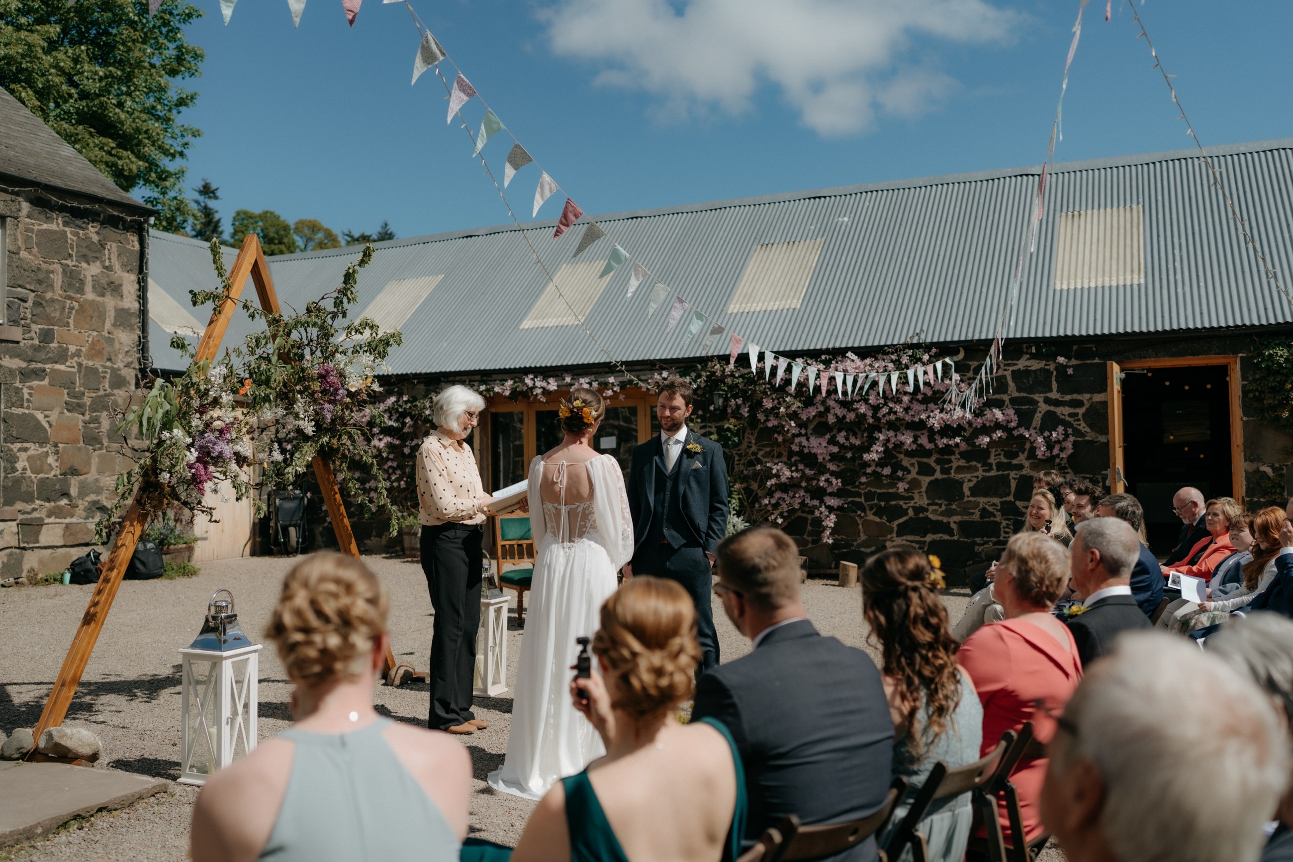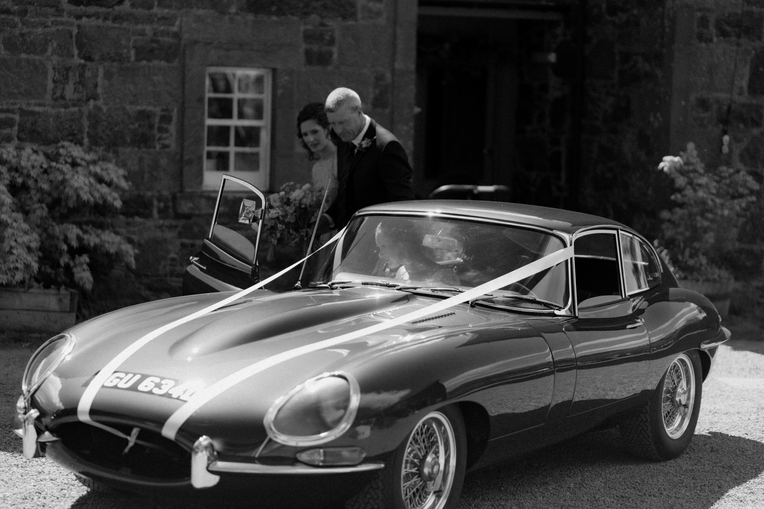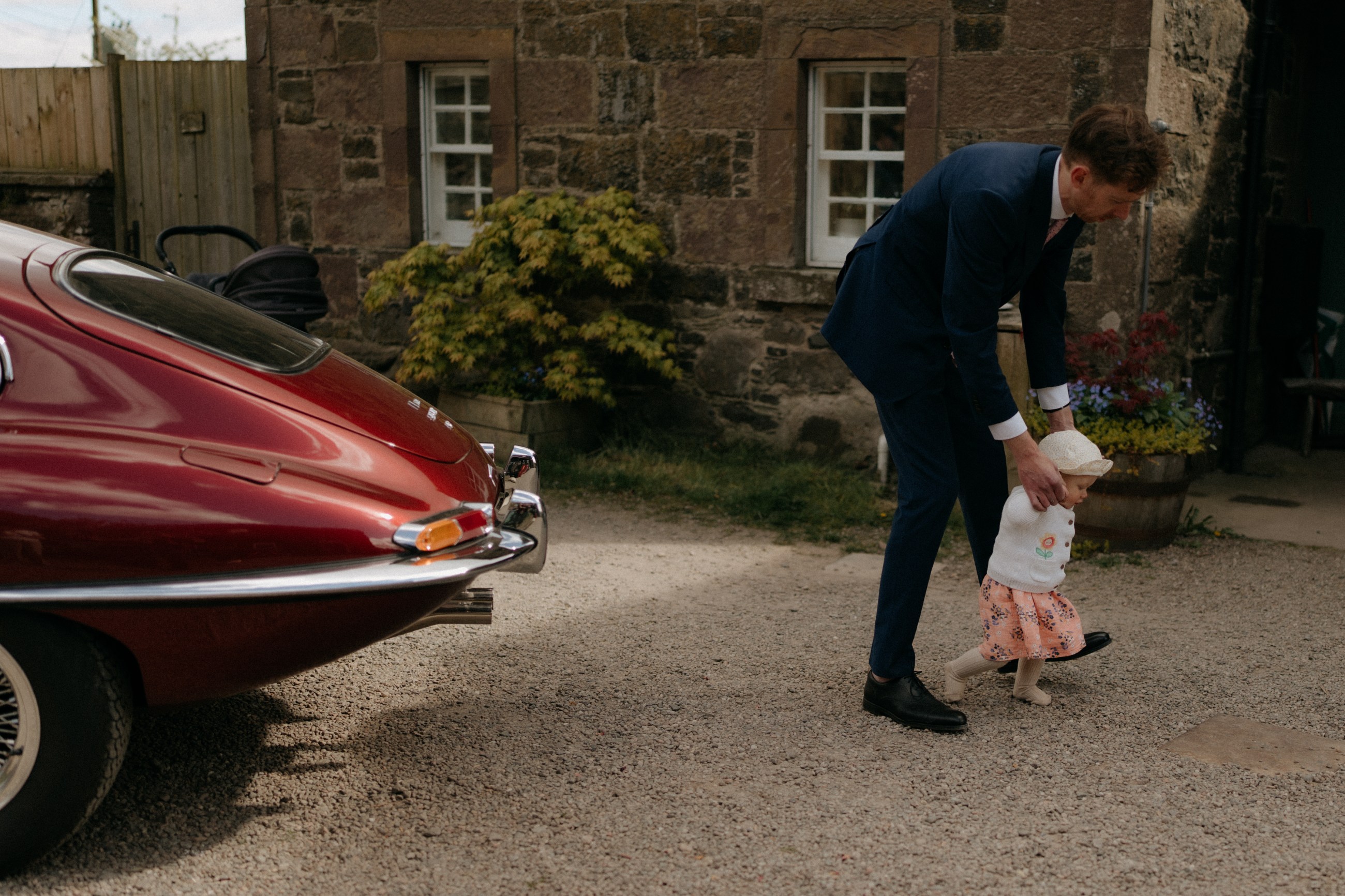 Sunshine, a courtyard ceremony, and a seriously beautiful old Jag — Andrea & John’s wedding at Comrie Croft was effortlessly elegant from start to finish.