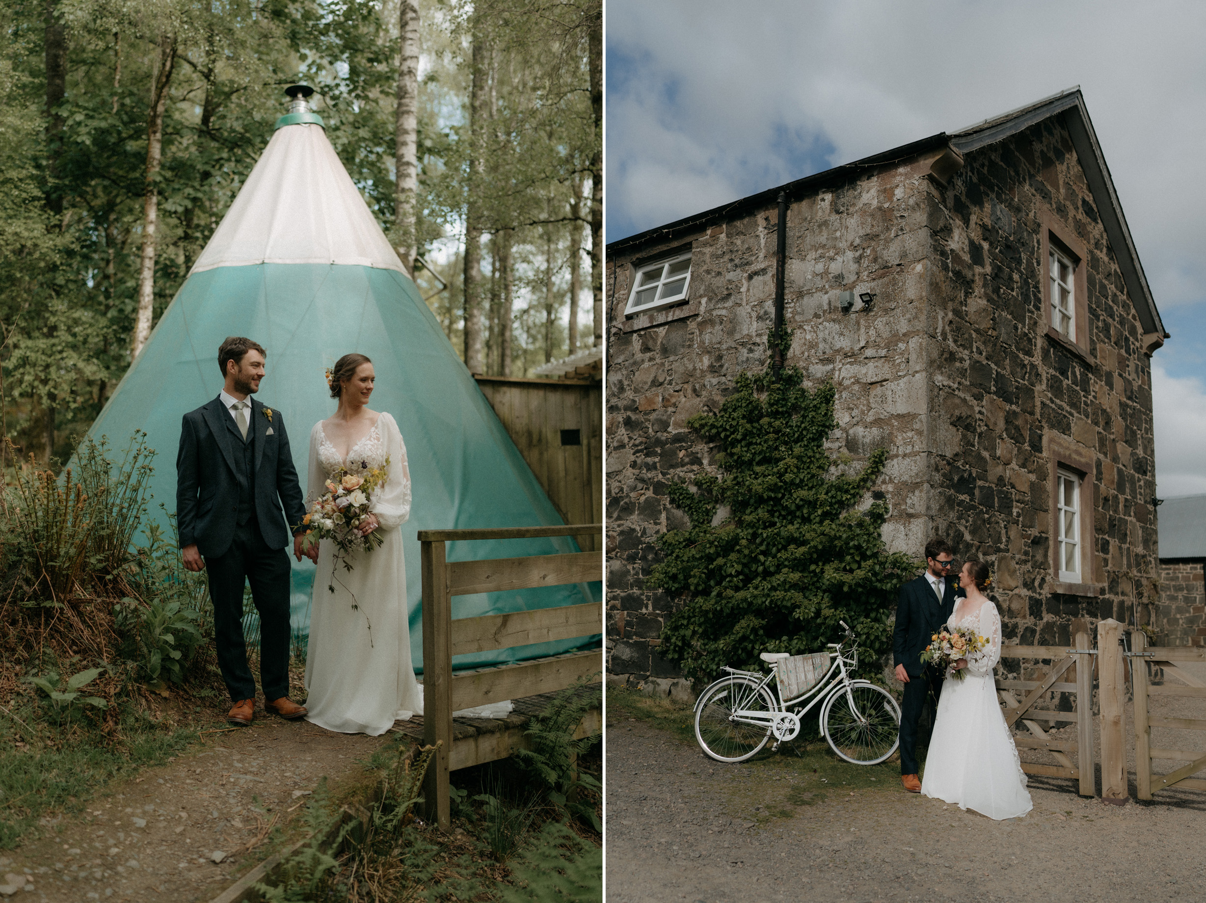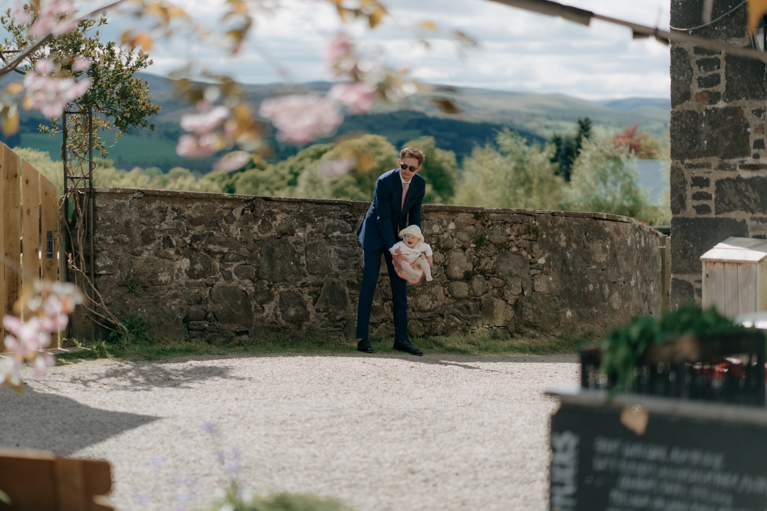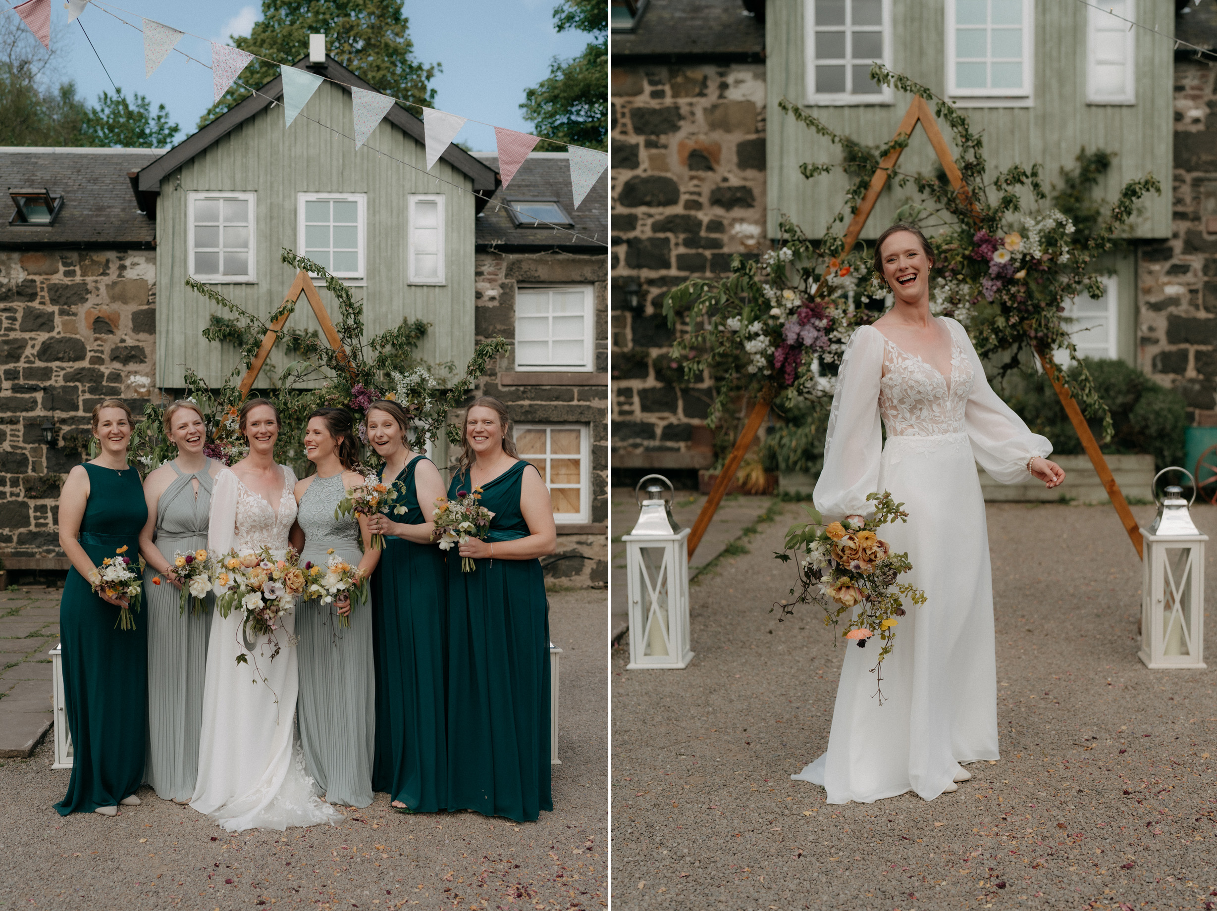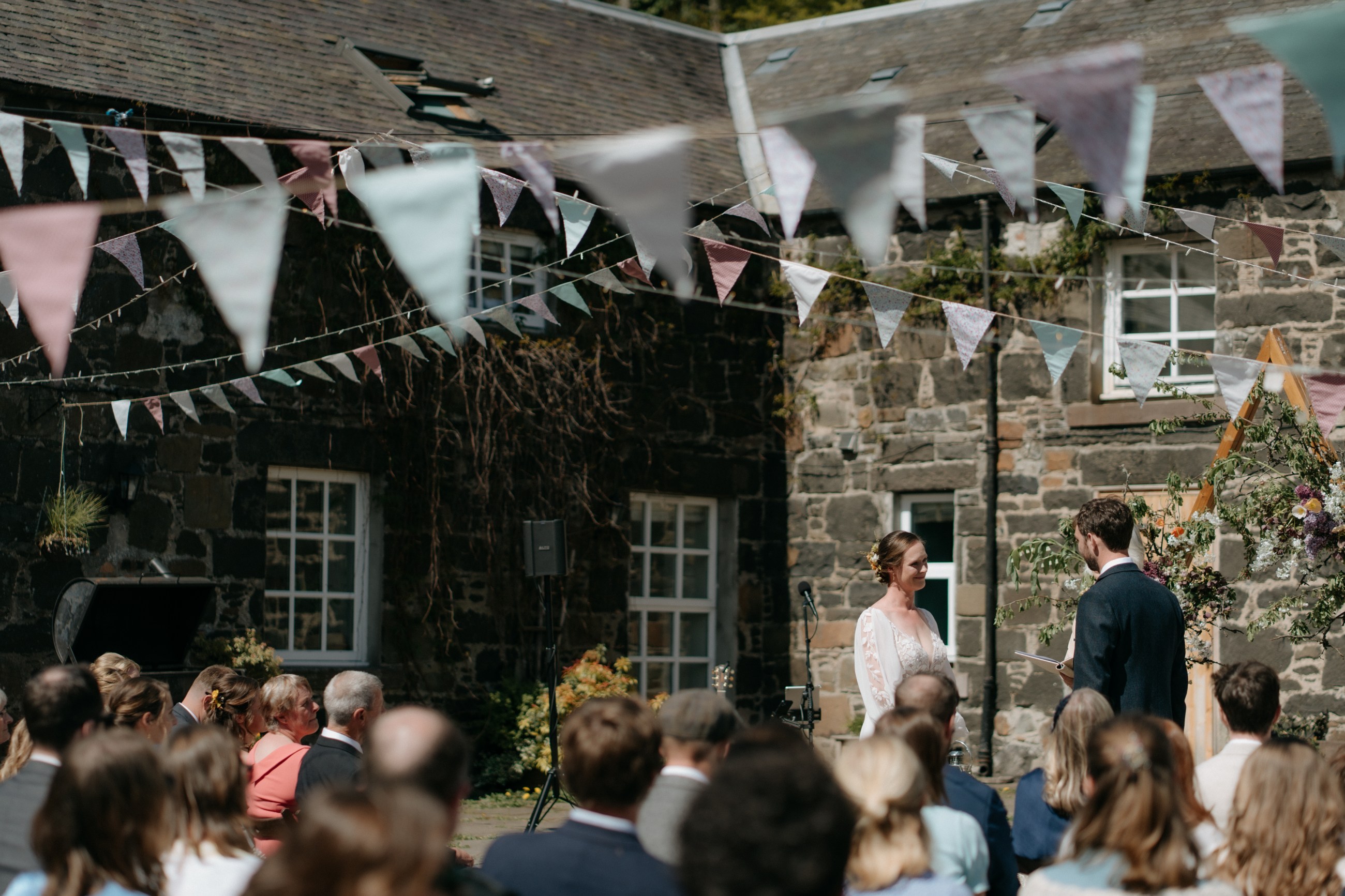 Sunshine, a courtyard ceremony, and a seriously beautiful old Jag — Andrea & John’s wedding at Comrie Croft was effortlessly elegant from start to finish.